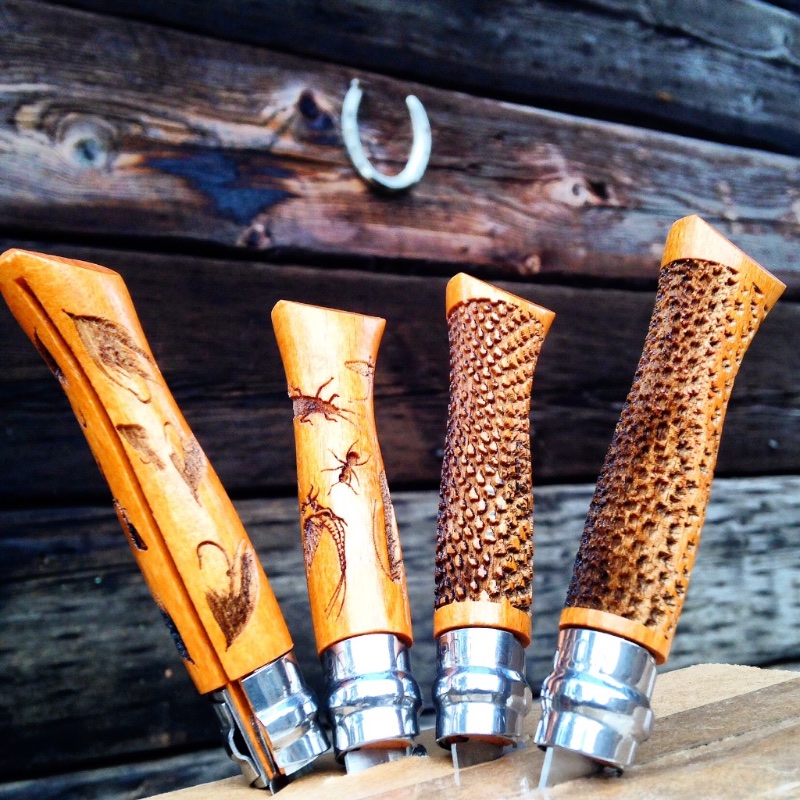 The Opinel has been a French tradition for generations, and has a world wide following for good reason. Simple, high quality design and materials in a nice, safe package. Carbon steel blade material comes very sharp and is easy to keep that way. The beechwood handles engrave well and can be personalized. A rotating crown lock assures the blade remains locked open or closed, which makes this an excellent food knife to throw in a bag or pack. Choose from Steelhead or Brown Trout - actual photos of fish scale patterns - Trout Insects or Steelhead Fly Box designs.
